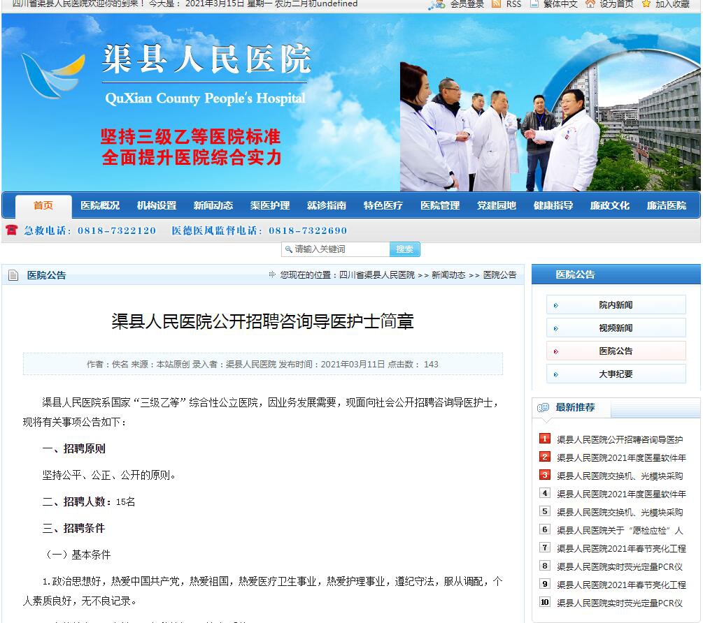 達(dá)聘網(wǎng)(www.0818rc.net)達(dá)州人才網(wǎng)訊,渠縣人民醫(yī)院系國(guó)家“三級(jí)乙等”綜合性公立醫(yī)院,因業(yè)務(wù)發(fā)展需要,現(xiàn)面向社會(huì)公開(kāi)招聘咨詢導(dǎo)醫(yī)護(hù)士,現(xiàn)將有關(guān)事項(xiàng)公告如下: